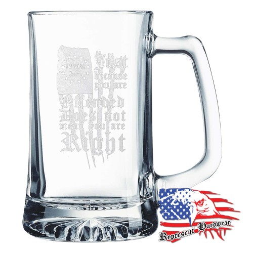 We custom Laser Engrave these 14 oz Beer Mug with Handle's with the graphic of Just because you are Offended Does not mean you are Right - 1776% Sure. We also personalize them with your name, or a logo, just call us for details.