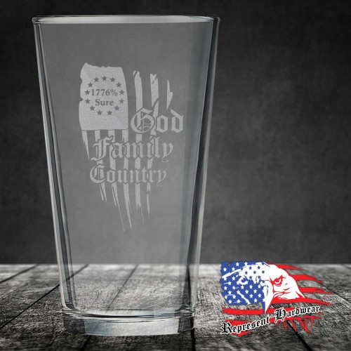 We custom Laser Engrave these 14 oz Beer Mug with Handle's with the graphic of God Family Country - 1776% Sure. We also personalize them with your name, or a logo, just call us for details.