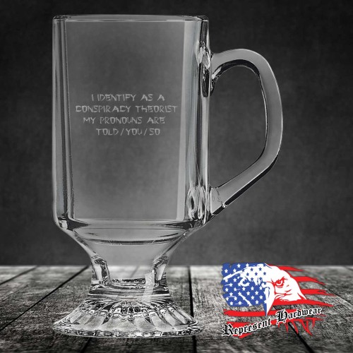 We custom Laser Engrave these 10 oz Clear Footed Coffee Mug's with the graphic of I Identify as a conspiracy Theorist - Chinese Font. We also personalize them with your name, or a logo, just call us for details.