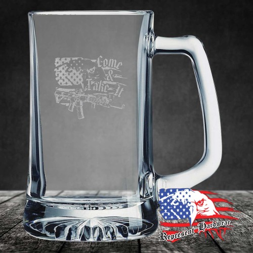We custom Laser Engrave these 25 oz Beer Mug with Handle's with the graphic of Come and Take It - Represent. We also personalize them with your name, or a logo, just call us for details.