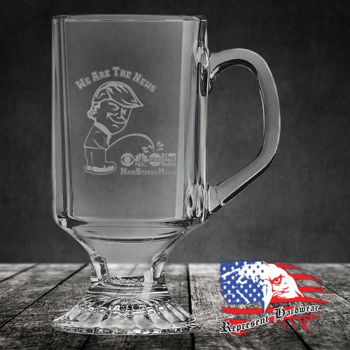 We custom Laser Engrave these 10 oz Clear Footed Coffee Mug's with the graphic of Trumpster - We are the News - The MSM. We also personalize them with your name, or a logo, just call us for details.