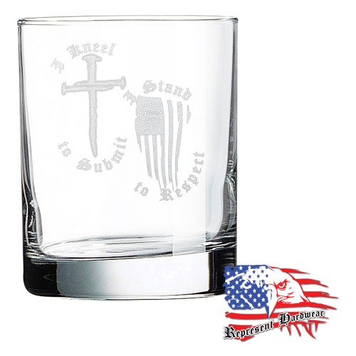 We custom Laser Engrave these 10 1/2 oz On The Rocks Glass's with the graphic of I Kneel to Submit, I Stand to Respect - 1776% Sure. We also personalize them with your name, or a logo, just call us for details.