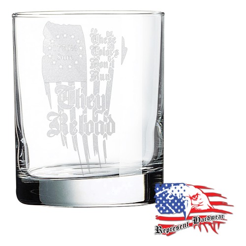We custom Laser Engrave these 10 1/2 oz On The Rocks Glass's with the graphic of These Colors Don't Run They Reload - 1776% Sure. We also personalize them with your name, or a logo, just call us for details.