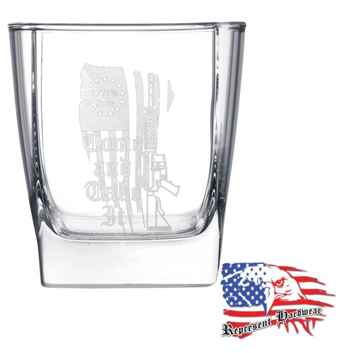 We custom Laser Engrave these 10 1/2 oz Square On The Rocks Glass's with the graphic of Come and Take It - 1776% Sure. We also personalize them with your name, or a logo, just call us for details.