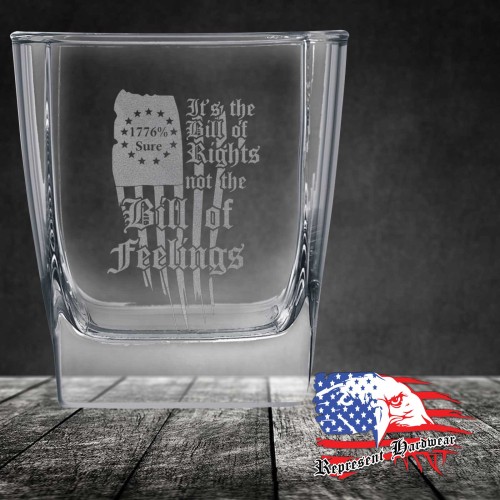 We custom Laser Engrave these 10 1/2 oz Square On The Rocks Glass's with the graphic of It's the Bill of Rights not the Bill of Feelings - 1776% Sure. We also personalize them with your name, or a logo, just call us for details.