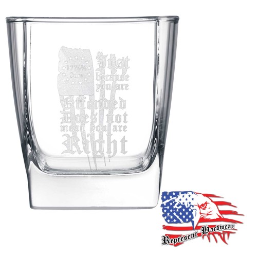 We custom Laser Engrave these 10 1/2 oz Square On The Rocks Glass's with the graphic of Just because you are Offended Does not mean you are Right - 1776% Sure. We also personalize them with your name, or a logo, just call us for details.