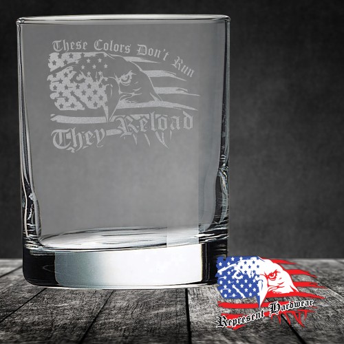 We custom Laser Engrave these 10 1/2 oz On The Rocks Glass's with the graphic of These Colors Don't Run They Reload - Represent. We also personalize them with your name, or a logo, just call us for details.