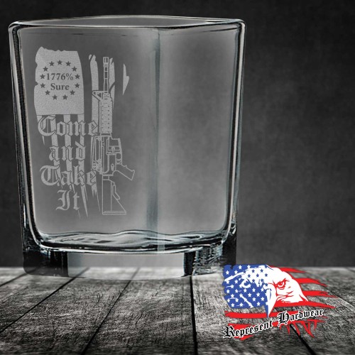 We custom Laser Engrave these 2 1/4 oz Square Shot Glass's with the graphic of Come and Take It - 1776% Sure. We also personalize them with your name, or a logo, just call us for details.