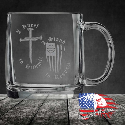 We custom Laser Engrave these 10 oz Round Rocks Glass's with the graphic of I Kneel to Submit, I Stand to Respect - 1776% Sure. We also personalize them with your name, or a logo, just call us for details.