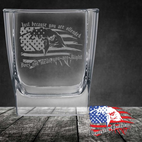 We custom Laser Engrave these 10 1/2 oz Square On The Rocks Glass's with the graphic of Just because you are Offended Does not mean you are Right. We also personalize them with your name, or a logo, just call us for details.
