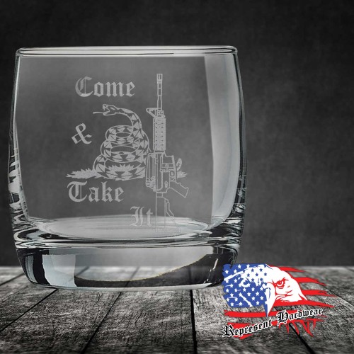 We custom Laser Engrave these 10 oz On The Rocks Glass's with the graphic of Come & Take It - Snake Bite. We also personalize them with your name, or a logo, just call us for details.