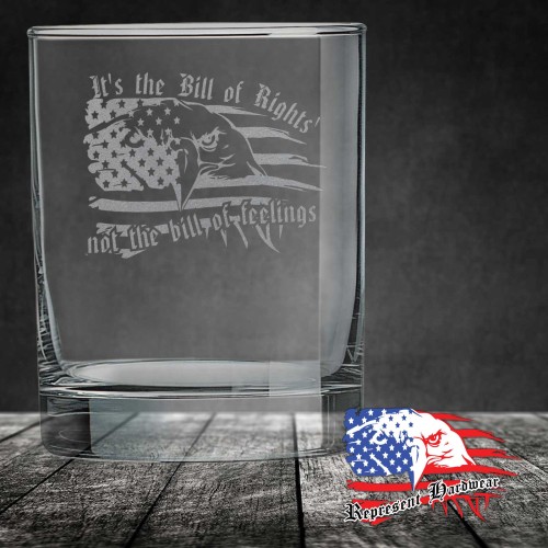 We custom Laser Engrave these 13 3/4 oz Round Double Old Fashioned Glass's with the graphic of It's the Bill of Rights not the Bill of Feelings - Represent. We also personalize them with your name, or a logo, just call us for details.