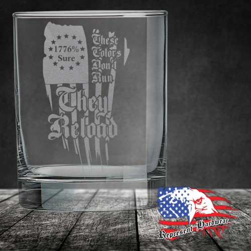 We custom Laser Engrave these 13 3/4 oz Round Double Old Fashioned Glass's with the graphic of These Colors Don't Run They Reload - 1776% Sure. We also personalize them with your name, or a logo, just call us for details.