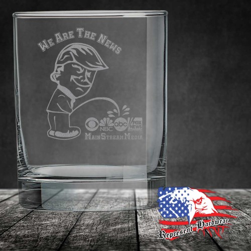 We custom Laser Engrave these 13 3/4 oz Round Double Old Fashioned Glass's with the graphic of Trumpster - We are the News - The MSM. We also personalize them with your name, or a logo, just call us for details.
