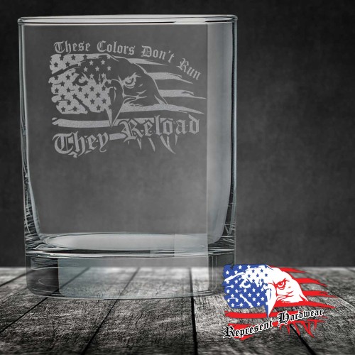 We custom Laser Engrave these 13 3/4 oz Round Double Old Fashioned Glass's with the graphic of These Colors Don't Run They Reload - Represent. We also personalize them with your name, or a logo, just call us for details.