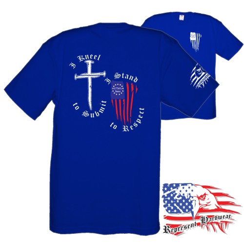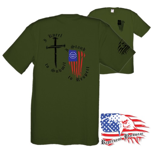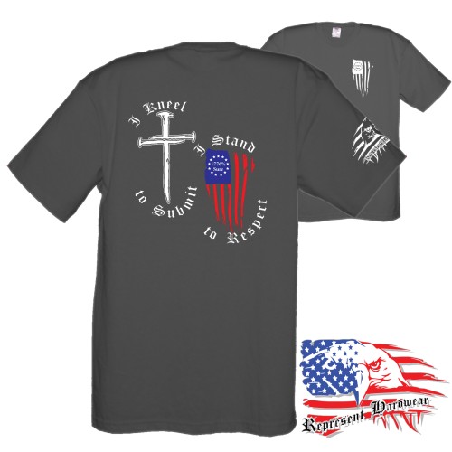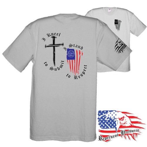 As an apprentice of history, when I witnessed the NFL take a knee, I wondered how an athlete that makes millions of dollars for throwing a ball could be so, well, basically, STUPID!, Yep, just plain uneducated stupid. In history, when you take a knee, you are surrendering, it has never been a position of strength. Historically many who raised a fist while on the knee meet a swift execution. I started thinking, I take a Knee to my Lord and Savior, but I Stand by my God, Family and Country which lead to the creation of Represent Hard Wear and this design.