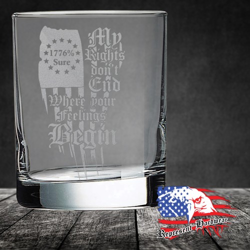 We custom Laser Engrave these 10 1/2 oz On The Rocks Glass's with the graphic of My Rights don't End Where your feelings Begin - 1776% Sure. We also personalize them with your name, or a logo, just call us for details.